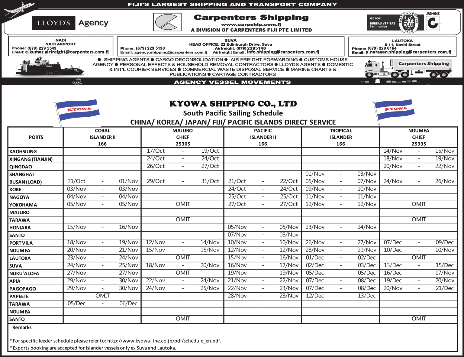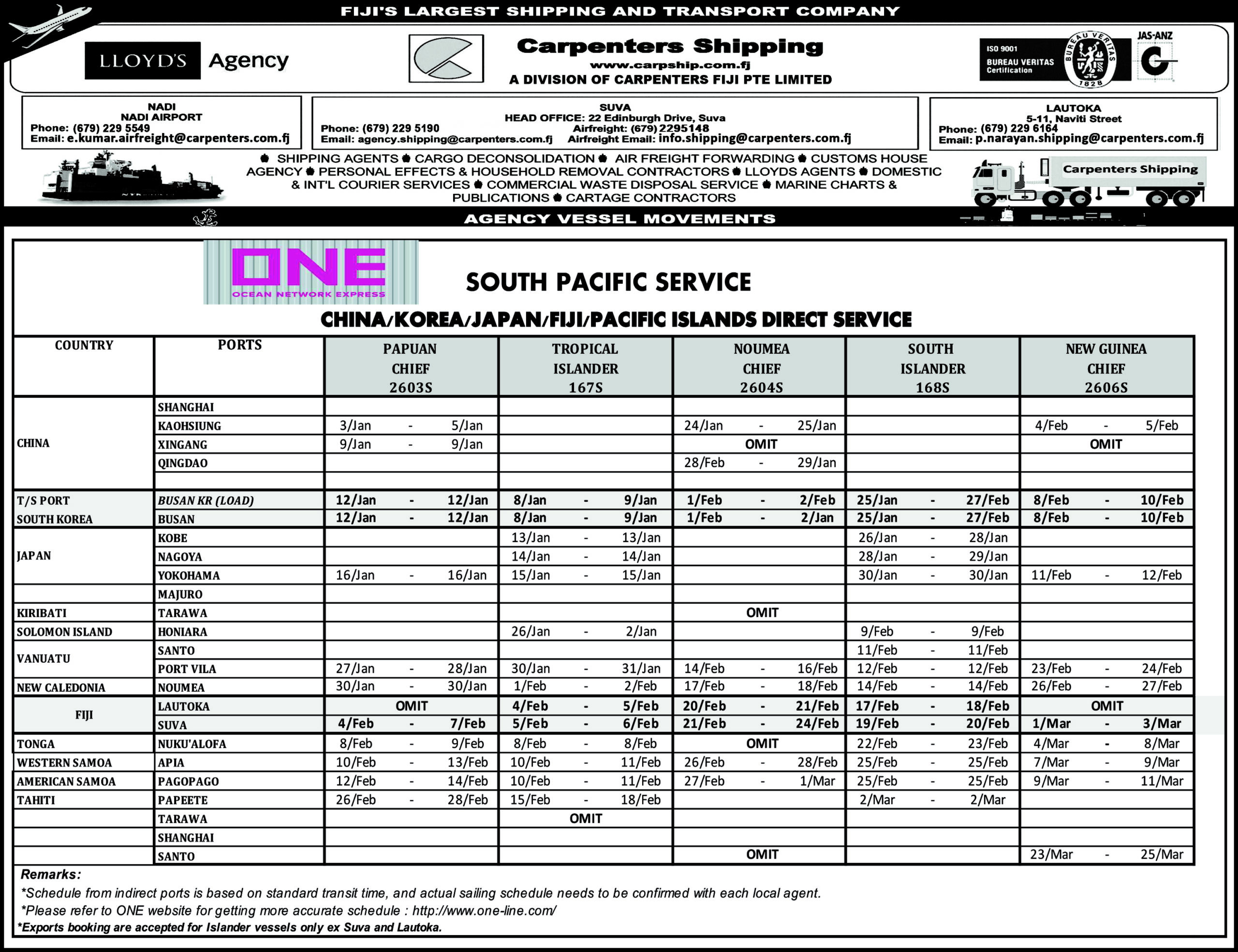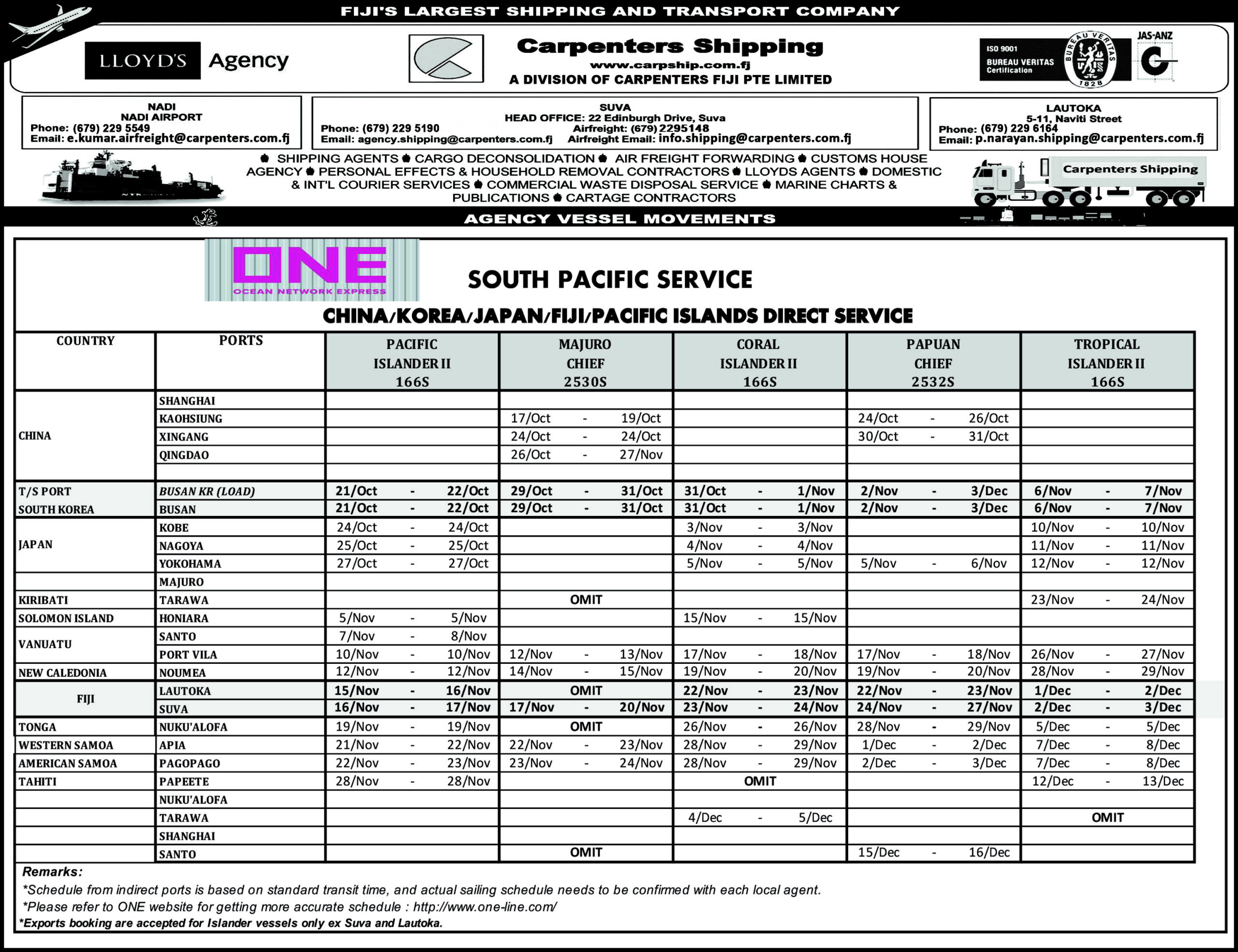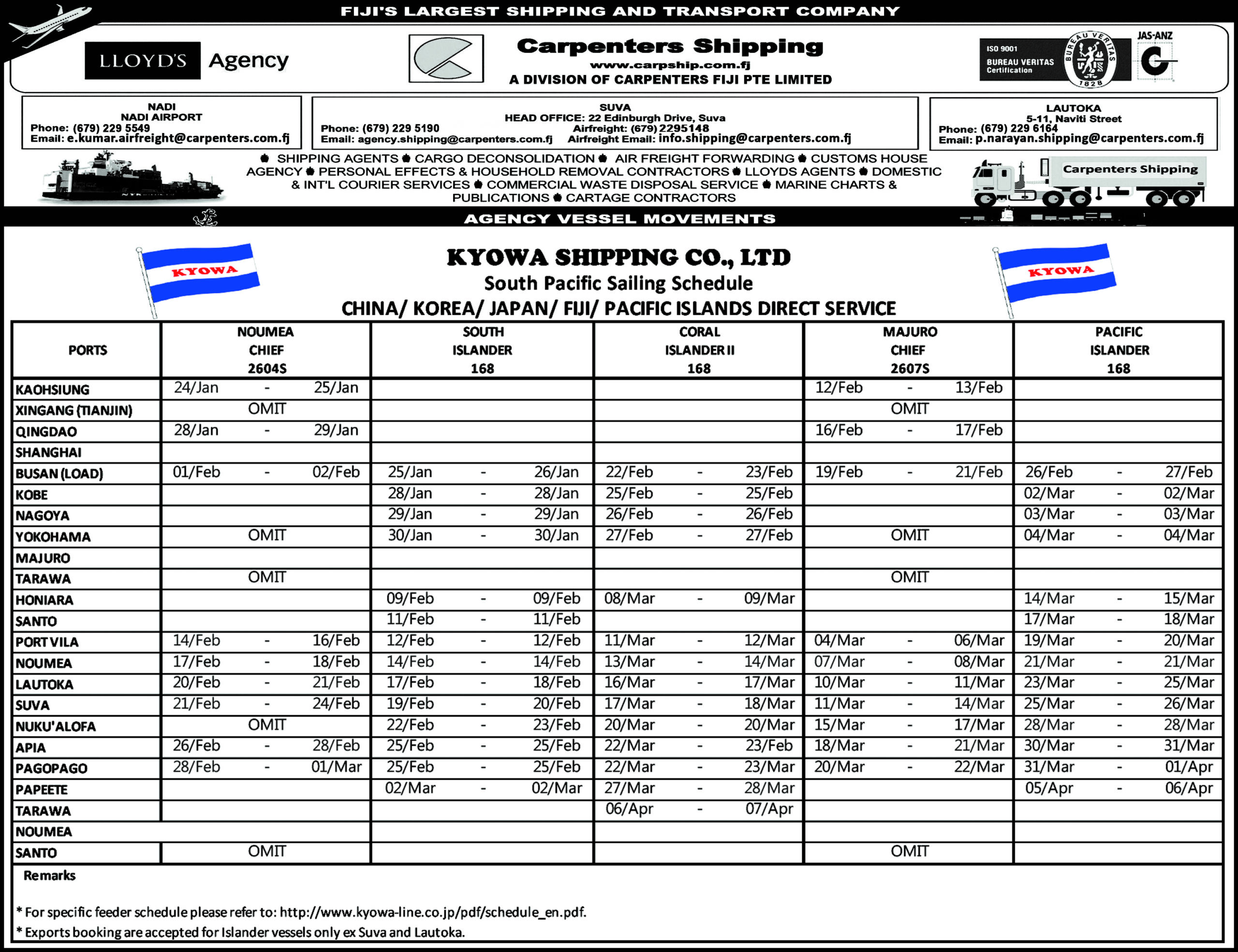 Schedule OUR SHIPPING SCHEDULEPlease click below to view the latest shipping schedule for Carpenters Shipping. KYOWA SHIPPING CO. LTDPlease click below to view. SOUTH PACIFIC SERVICEPlease click below to view.