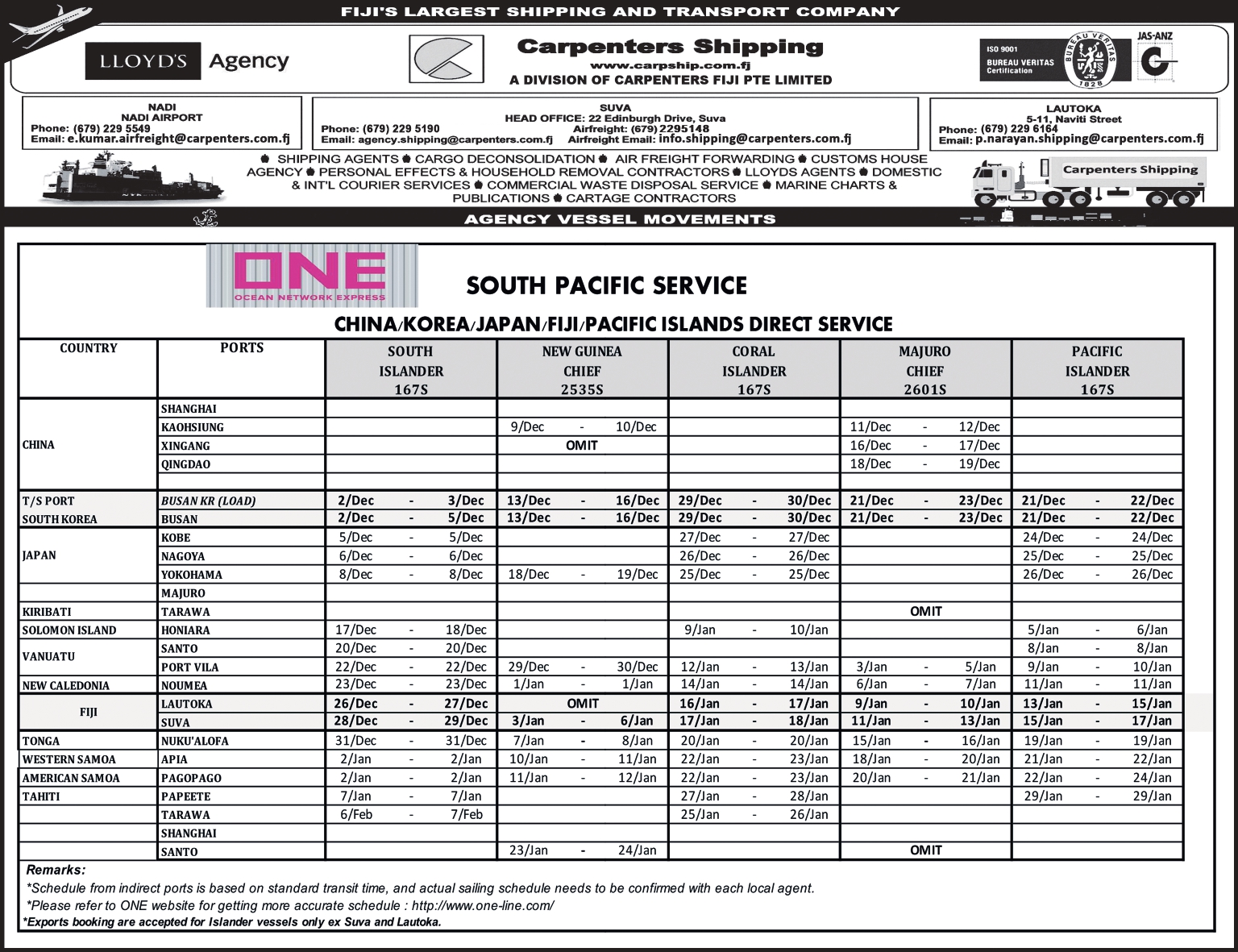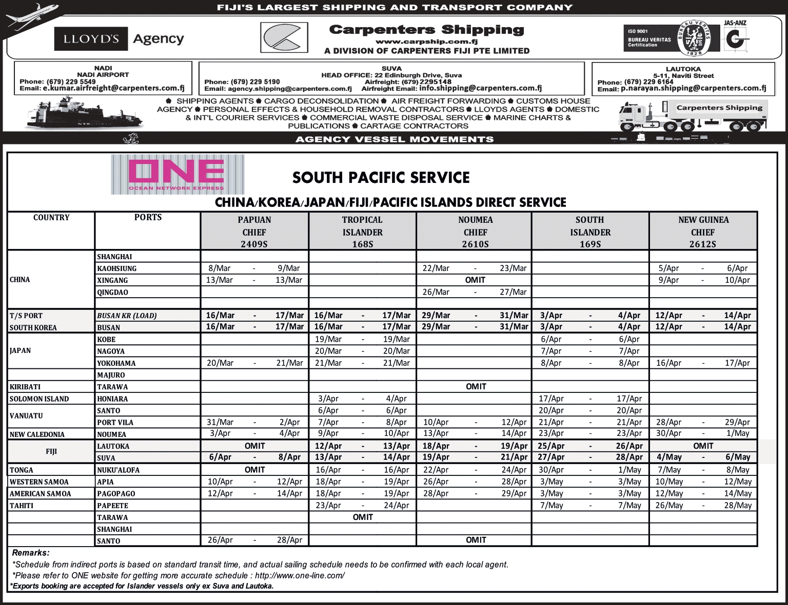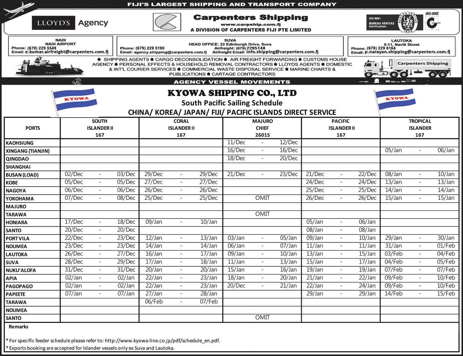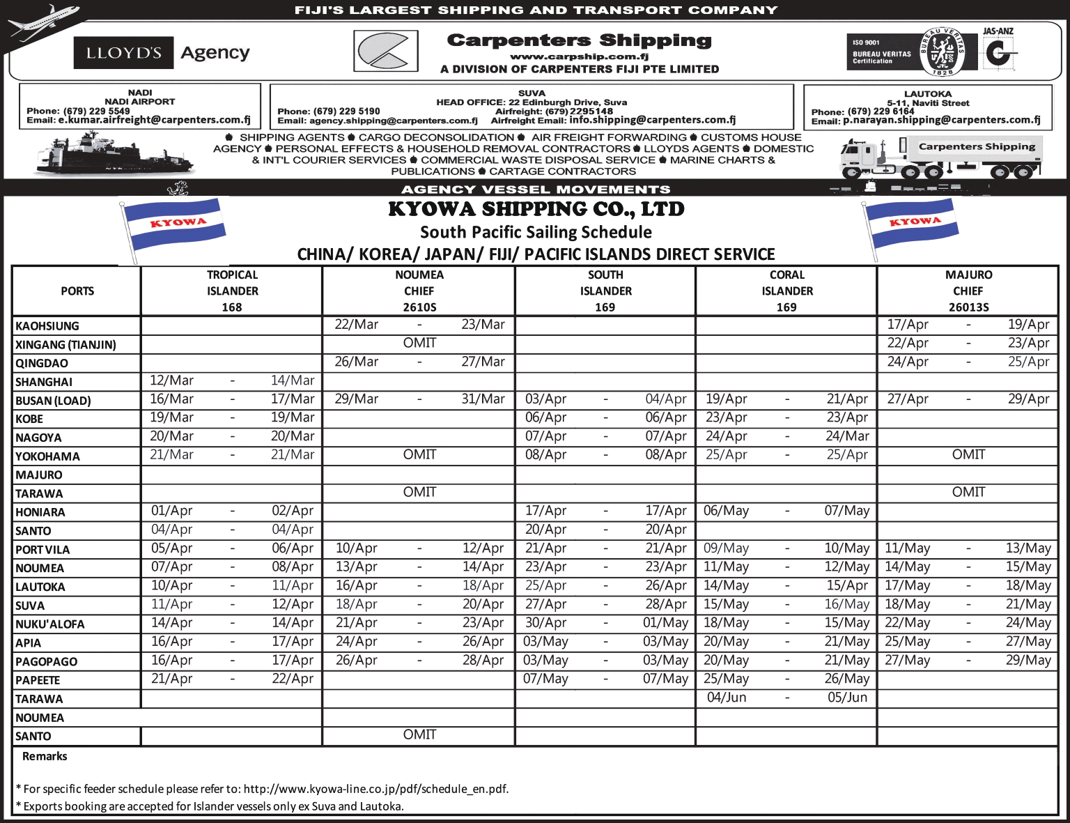 Schedule OUR SHIPPING SCHEDULEPlease click below to view the latest shipping schedule for Carpenters Shipping. KYOWA SHIPPING CO. LTDPlease click below to view. SOUTH PACIFIC SERVICEPlease click below to view.